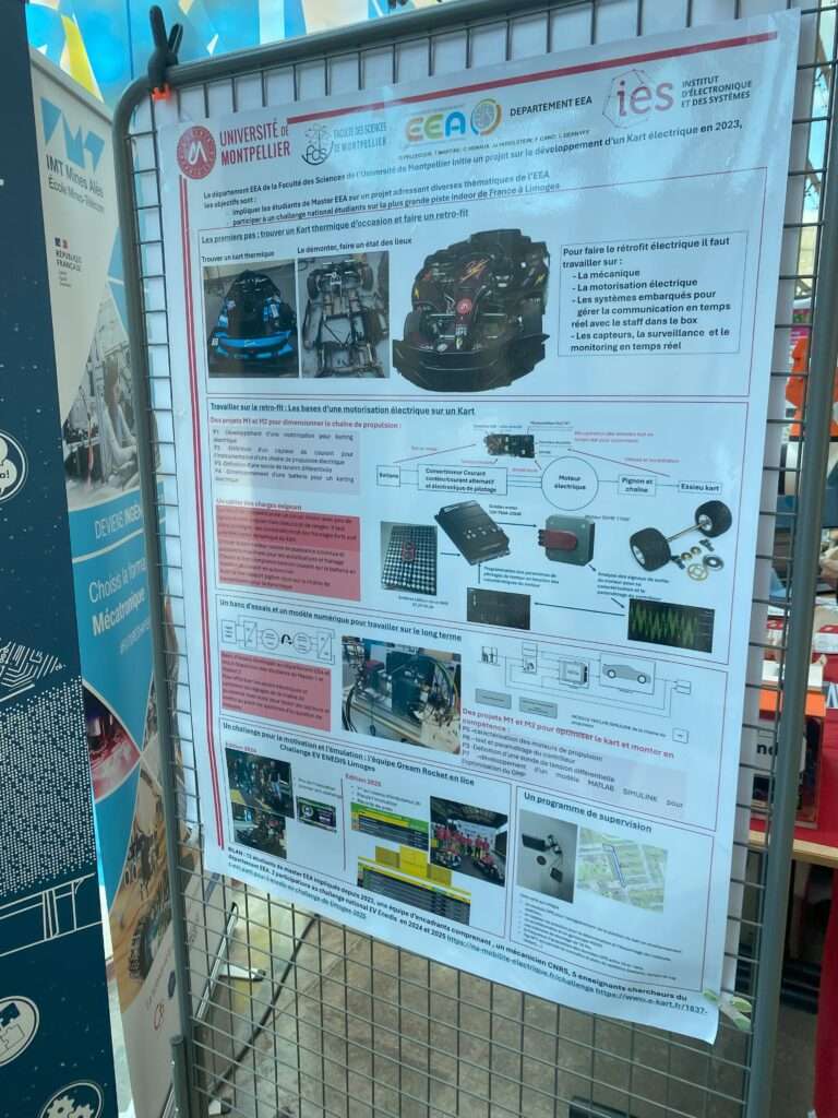 Le département EEA était représenté par trois enseignants et six étudiants de Master 1. Accompagnés d’un kart électrique et de son banc d’essais, ces intervenants ont su capter l’attention d’un large public, allant des collégiens aux élèves des classes préparatoires prestigieuses de Joffre.